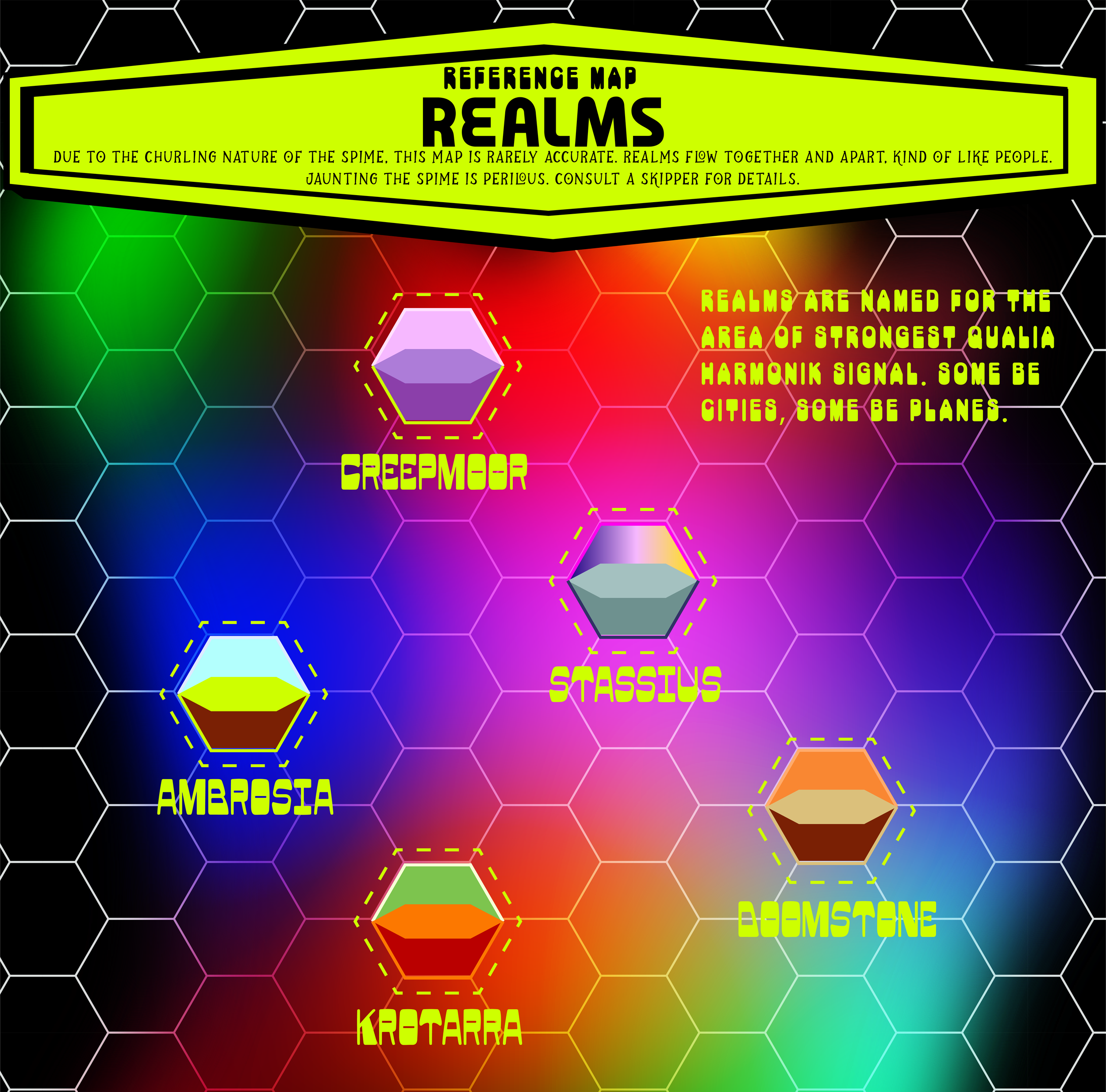 Just a lil sample map. Due to the constant churning of the Spime, the exact position of realms are always in flux. Best to use transport to find your way to one. Unless…